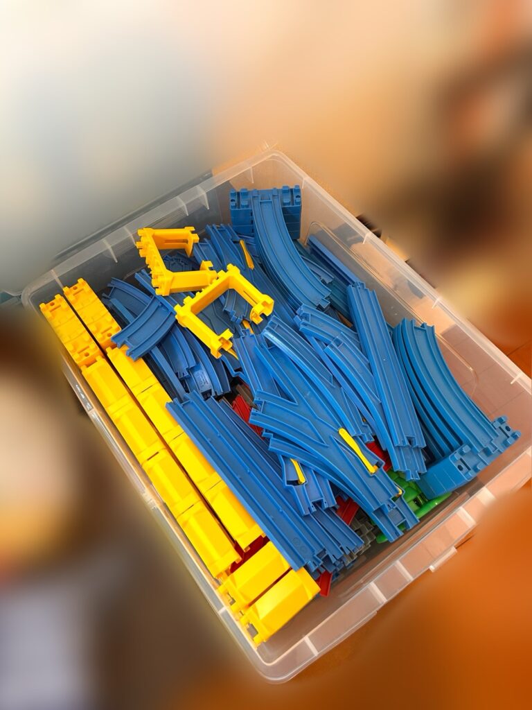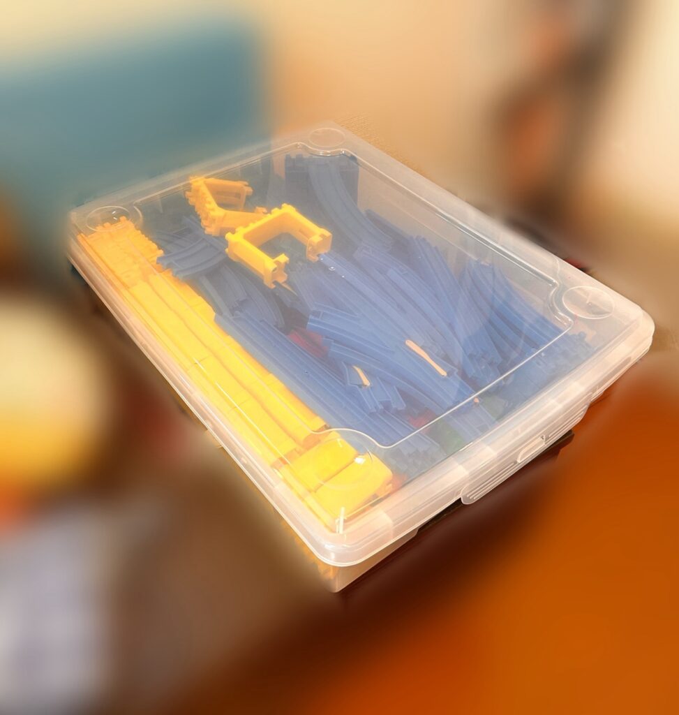 プラレール収納 こども 2025.09.22 こんにちは、みんくです。 3歳息子の趣味、プラレール。 友人のお下がりで大量にあるレールをなんとかしたい。。 と、ダイソーで衣装ケースを購入! 結構良い感じじゃない? 黄色の橋脚とニュー坂レール(R-06)が強敵でなかなかサイズの合う収納がなかったので助かった。 ちなみにニュー坂レールの長さは52.9センチ。 約53センチのレールがしまえる収納なんて滅多にないからね。。 ダイソーで買える「ベッド下収納ケース(ワイド、フタ付)」770円でした♪